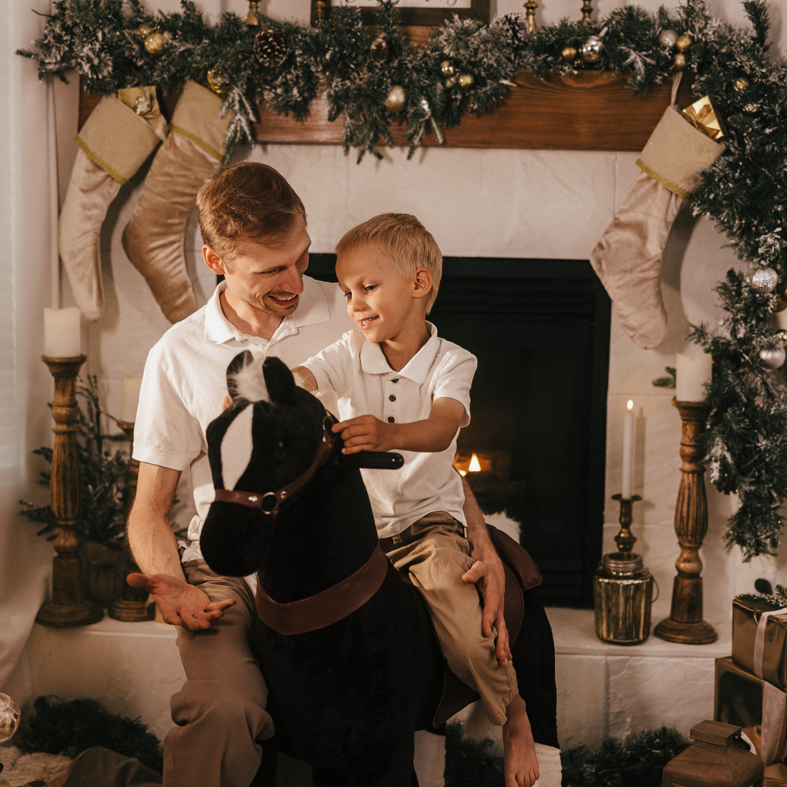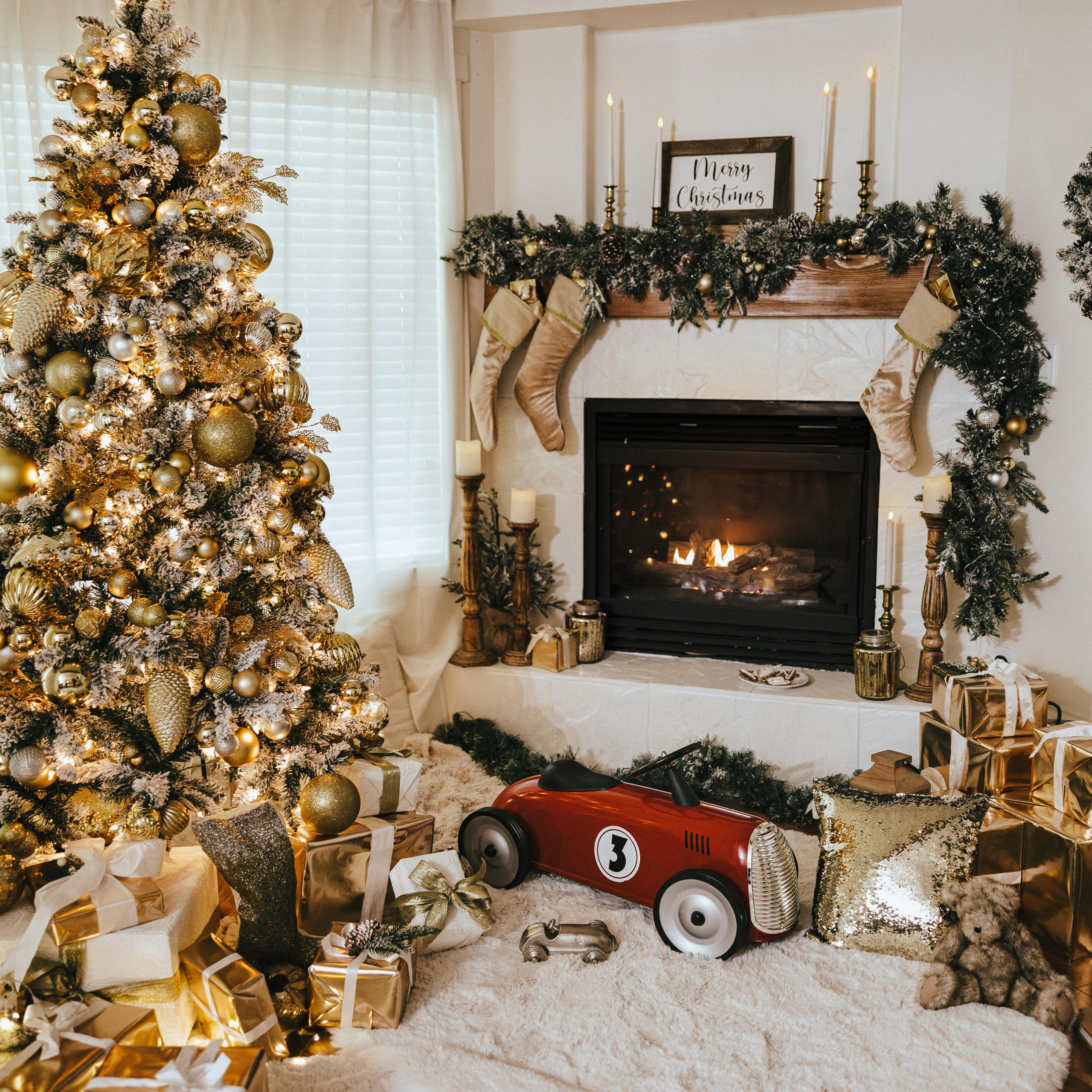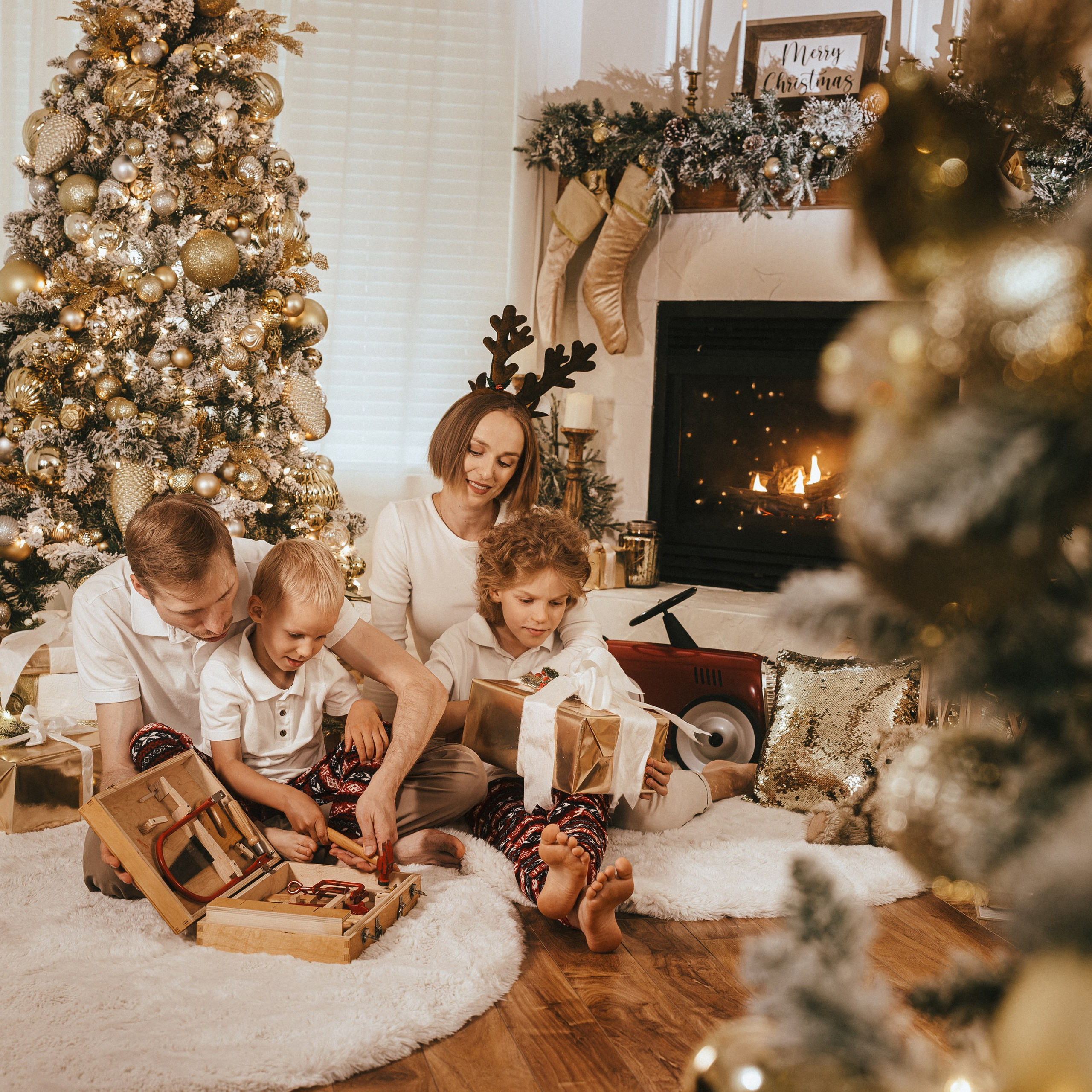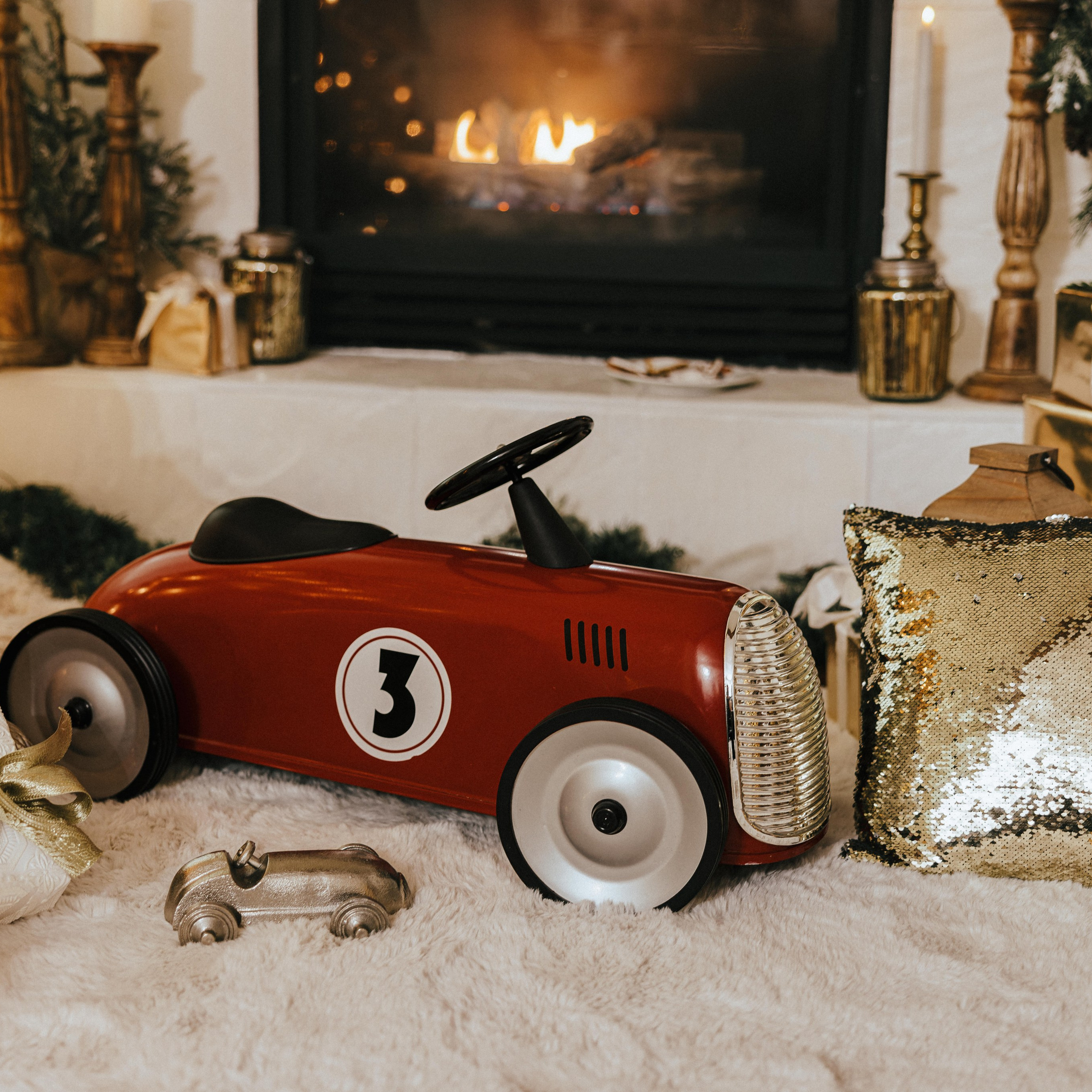 — Christmas props available for use (rocking horse, presents, hot chocolate, red metal vintage race car, and more)
